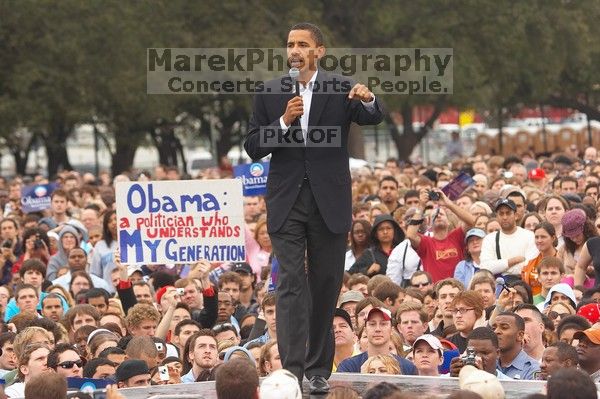 | Obama speaking to a crowd of over 20,000 supporters at The Barack Obama "Kick-Ass" Rally--the Obama for president, 2008, rally, held in Austin, Friday, February 23, 2007. |