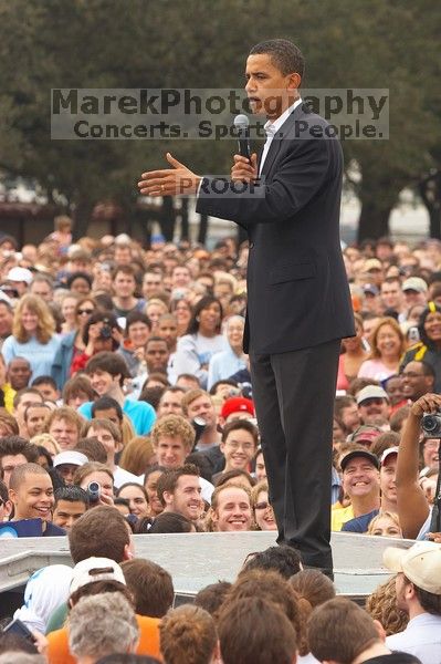 | Obama speaking to a crowd of over 20,000 supporters at The Barack Obama "Kick-Ass" Rally--the Obama for president, 2008, rally, held in Austin, Friday, February 23, 2007. |