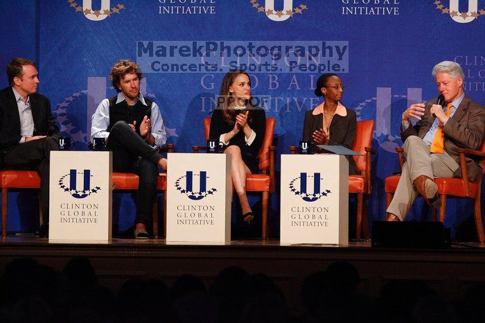 | Paul Bell (1-L), president of Dell Global Public, Blake Mycoskie (2-L), founder of TOMS shoes, Natalie Portman (C), Mambidzeni Madzivire (2-R), BME graduate student at Mayo Graduate School, and Former President Bill Clinton (1-R) at the first plenary session of the CGIU meeting. Day one of the 2nd Annual Clinton Global Initiative University (CGIU) meeting was held at The University of Texas at Austin, Friday, February 13, 2009. |