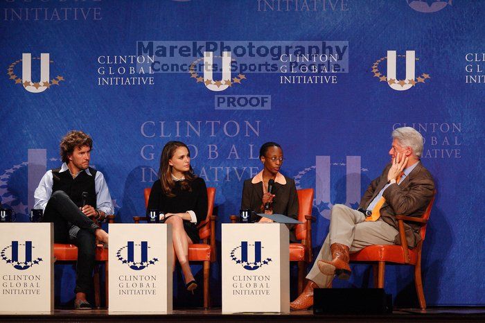 | Blake Mycoskie (1-L), founder of TOMS shoes, Natalie Portman (2-L), Mambidzeni Madzivire (2-R), BME graduate student at Mayo Graduate School, and Former President Bill Clinton (1-R) at the first plenary session of the CGIU meeting. Day one of the 2nd Annual Clinton Global Initiative University (CGIU) meeting was held at The University of Texas at Austin, Friday, February 13, 2009. |