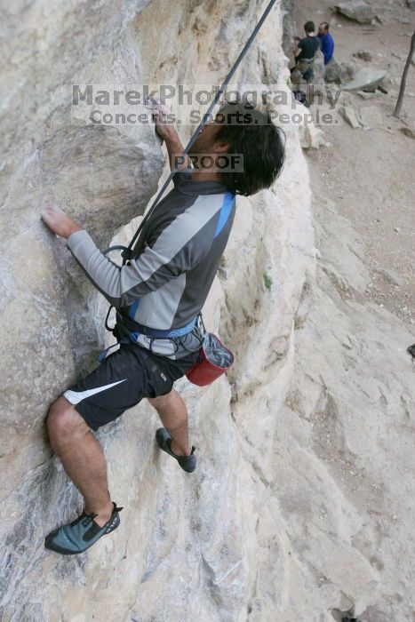 | Javier Morales top rope climbing Diving for Rocks (5.10d), photographed from the third bolt of Magster (5.10a). It was another long day of rock climbing at Seismic Wall on Austin's Barton Creek Greenbelt, Saturday, April 11, 2009. |
