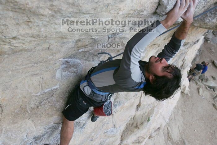| Javier Morales top rope climbing Diving for Rocks (5.10d), photographed from the third bolt of Magster (5.10a). It was another long day of rock climbing at Seismic Wall on Austin's Barton Creek Greenbelt, Saturday, April 11, 2009. |