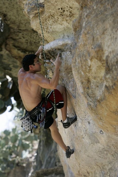| Chris Bottaro on Diving for Rocks (5.10d). It was another long day of rock climbing at Seismic Wall on Austin's Barton Creek Greenbelt, Sunday, June 090607, 2009. |