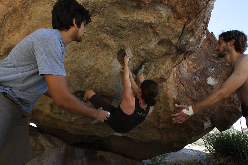 | Beth Marek rock climbing on No One Gets Out of Here Alive (V2) in Hueco Tanks State Park and Historic Site during the Hueco Tanks Awesome Fest 2010 trip, Sunday, May 23, 2010. |