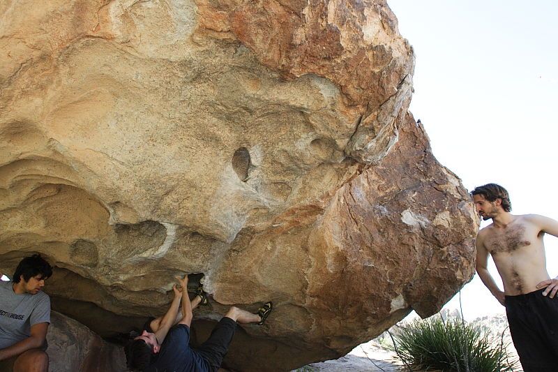 | Raanan Robertson rock climbing on No One Gets Out of Here Alive (V2) in Hueco Tanks State Park and Historic Site during the Hueco Tanks Awesome Fest 2010 trip, Sunday, May 23, 2010. |