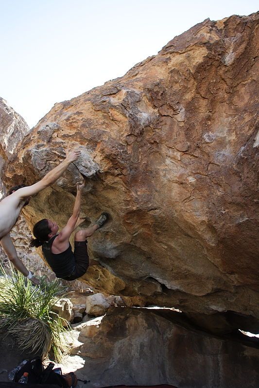 | Beth Marek rock climbing on No One Gets Out of Here Alive (V2) in Hueco Tanks State Park and Historic Site during the Hueco Tanks Awesome Fest 2010 trip, Sunday, May 23, 2010. |