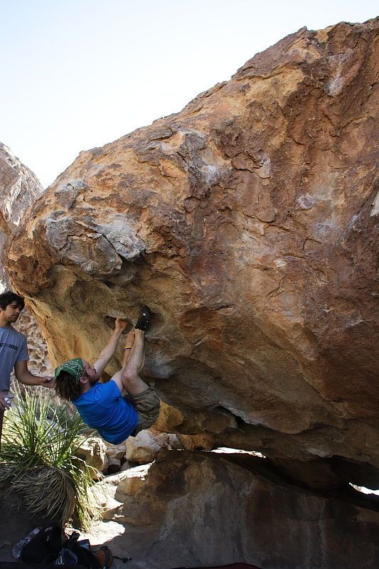 | Steve Marek rock climbing on No One Gets Out of Here Alive (V2) in Hueco Tanks State Park and Historic Site during the Hueco Tanks Awesome Fest 2010 trip, Sunday, May 23, 2010. |