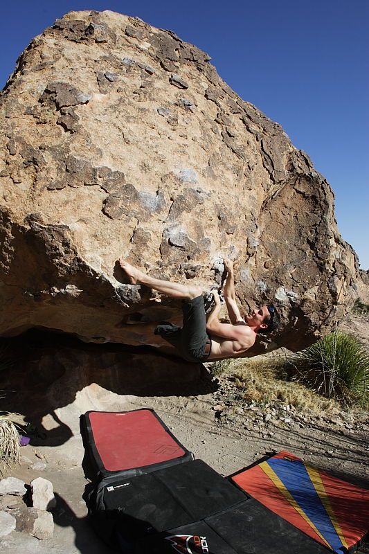 | Raanan Robertson rock climbing barefoot on No One Gets Out of Here Alive (V2) in Hueco Tanks State Park and Historic Site during the Hueco Tanks Awesome Fest 2010 trip, Sunday, May 23, 2010. |