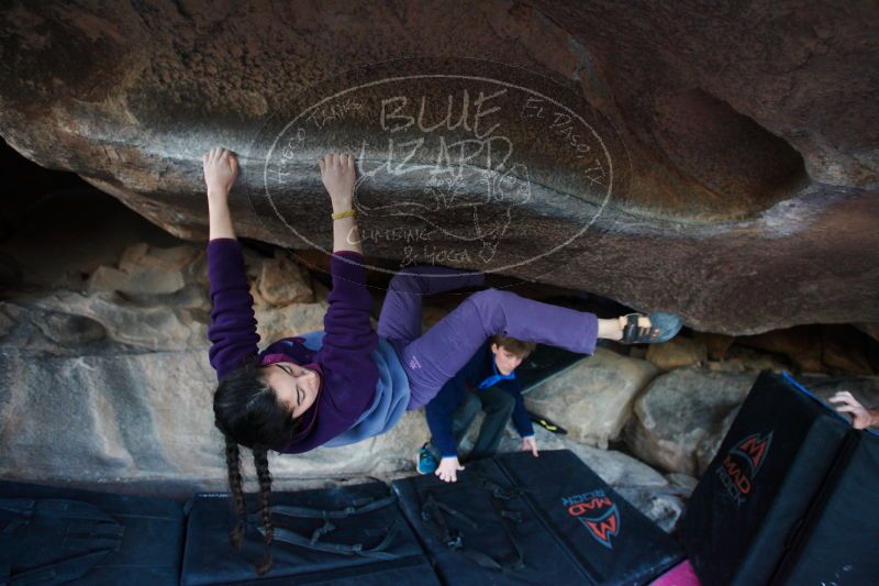 Blue Lizard Climbing and Yoga Hueco Tanks guiding, Kyle, Sam, and Sophie, on December 26, 2016