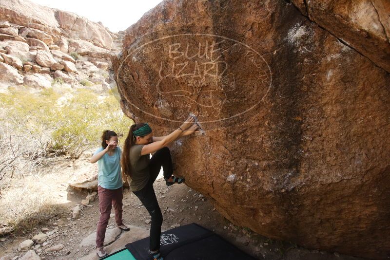 Blue Lizard Climbing and Yoga Hueco Tanks guiding on February 2, 2019, with Stephanie, Kelly, David, and Creedence |