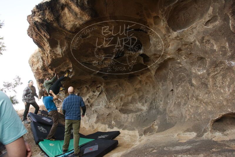 Blue Lizard Climbing and Yoga Hueco Tanks guiding on February 2, 2019, with Stephanie, Kelly, David, and Creedence |