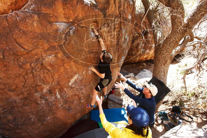 Blue Lizard Climbing and Yoga Hueco Tanks guiding on March 17, 2019, with Lance, Nick, Hudson,Mason, and Donna |