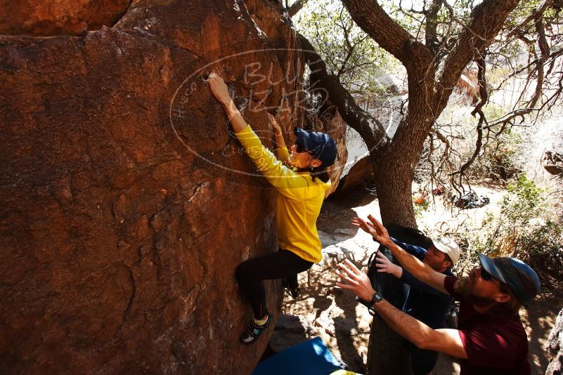 Blue Lizard Climbing and Yoga Hueco Tanks guiding on March 17, 2019, with Lance, Nick, Hudson,Mason, and Donna |
