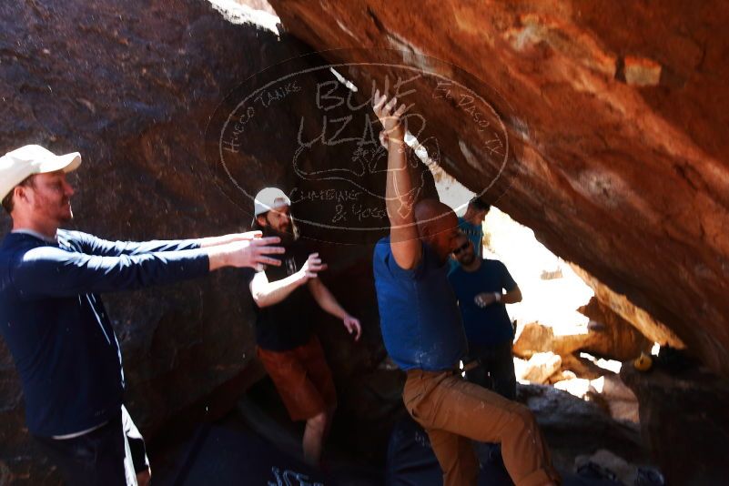 Blue Lizard Climbing and Yoga Hueco Tanks guiding on March 17, 2019, with Austin, MJ, Zak, Brian, and Lauren