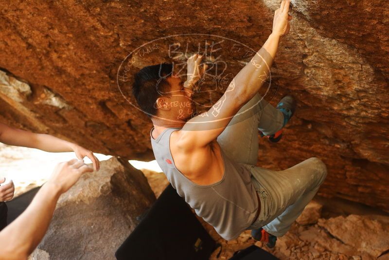 Blue Lizard Climbing and Yoga Hueco Tanks guiding on November 9, 2019, with Jason, Peter, Caleb, Chase, and Emily