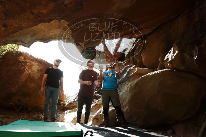 Blue Lizard Climbing and Yoga Hueco Tanks guiding on November 10, 2019, with Dom, Val, Caleb, Chase, and Emily |