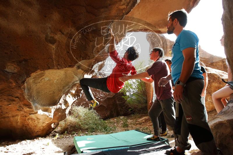Blue Lizard Climbing and Yoga Hueco Tanks guiding on November 10, 2019, with Dom, Val, Caleb, Chase, and Emily |