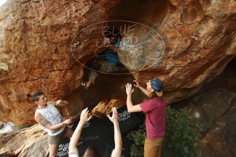 Blue Lizard Climbing and Yoga Hueco Tanks guiding on November 10, 2019, with Dom, Val, Caleb, Chase, and Emily |