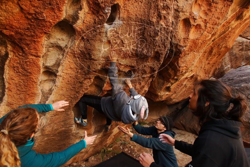 Blue Lizard Climbing and Yoga Hueco Tanks guiding on December 19, 2019, with Kenzie, Kat, Navish, Mariella, and Daniel |