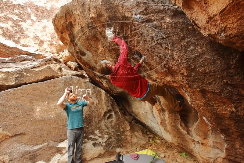 Blue Lizard Climbing and Yoga Hueco Tanks guiding on December 24, 2019, with Andrew & Kasey, Debbie & Max, Jeff, Tony, and Dom |
