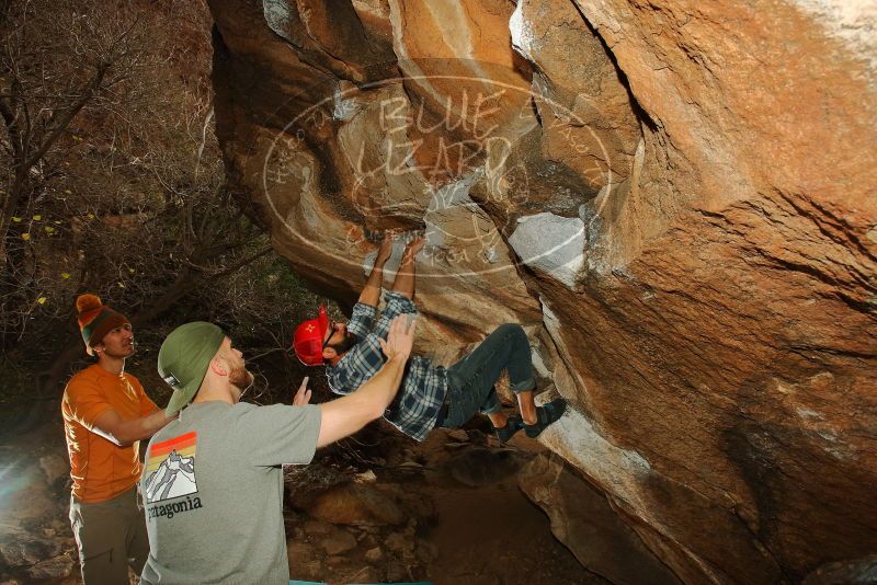 Blue Lizard Climbing and Yoga Hueco Tanks guiding on December 24, 2019, with Andrew & Kasey, Debbie & Max, Jeff, Tony, and Dom |