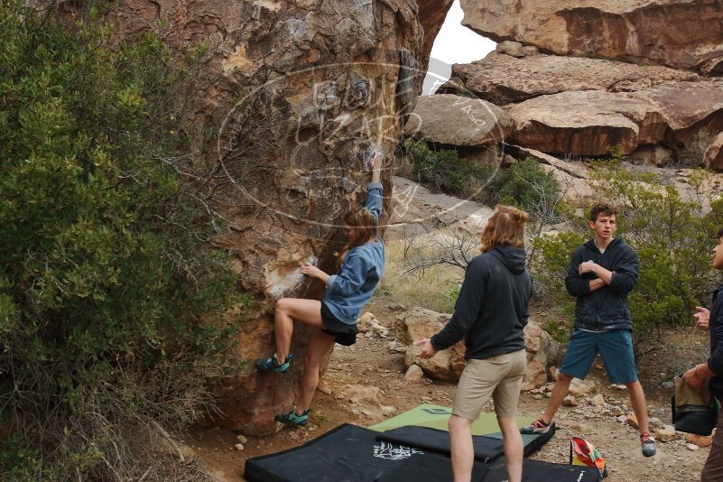 Blue Lizard Climbing and Yoga Hueco Tanks guiding on March 15, 2020, with Liam, Madison, Jack, and Stephen