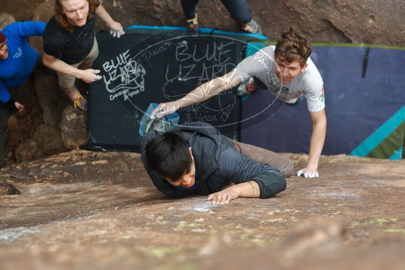 Blue Lizard Climbing and Yoga Hueco Tanks guiding on March 15, 2020, with Liam, Madison, Jack, and Stephen