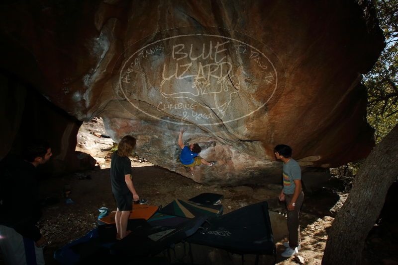 Blue Lizard Climbing and Yoga Hueco Tanks guiding on March 16, 2020, with Liam, Madison, Jack, and Stephen