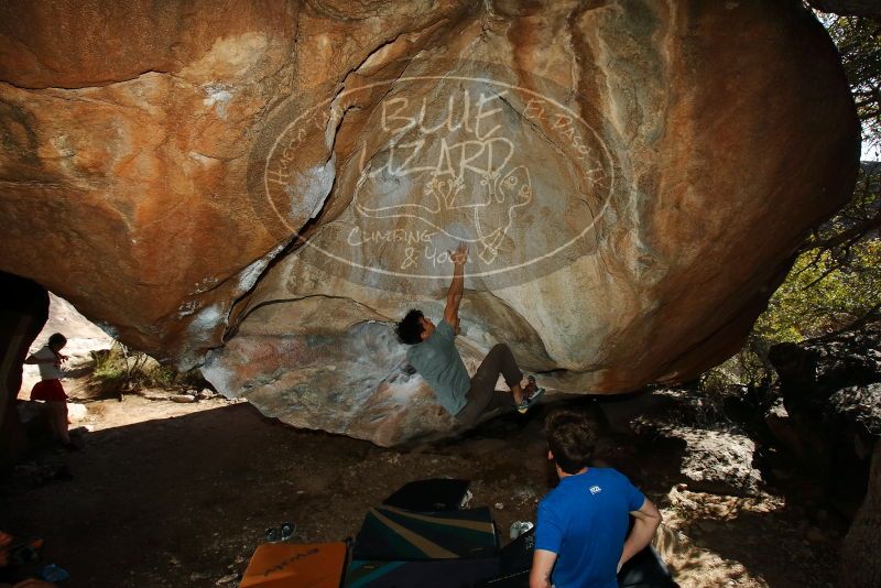Blue Lizard Climbing and Yoga Hueco Tanks guiding on March 16, 2020, with Liam, Madison, Jack, and Stephen