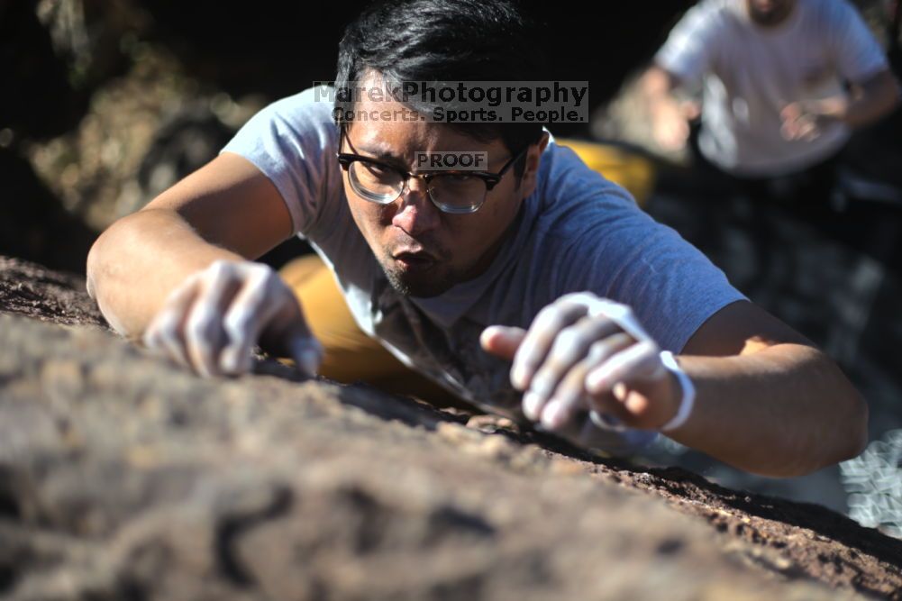 Blue Lizard Climbing and Yoga Hueco Tanks guiding on December 12, 2021, with Avery & Mia, Kevin, Jason, and JP