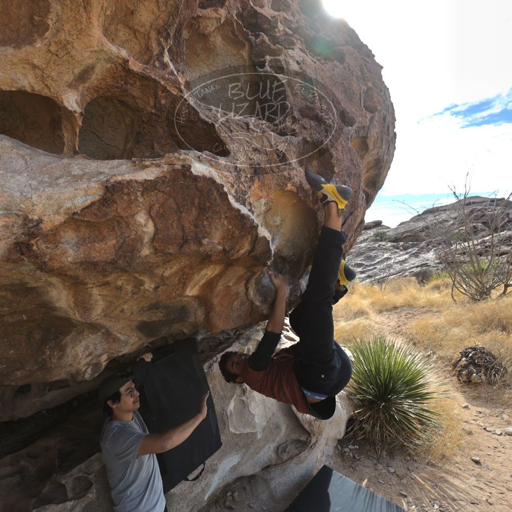 Blue Lizard Climbing and Yoga Hueco Tanks guiding on December 30, 2021, with Alastair, Callum, Chris, Giovanna, and Michael |