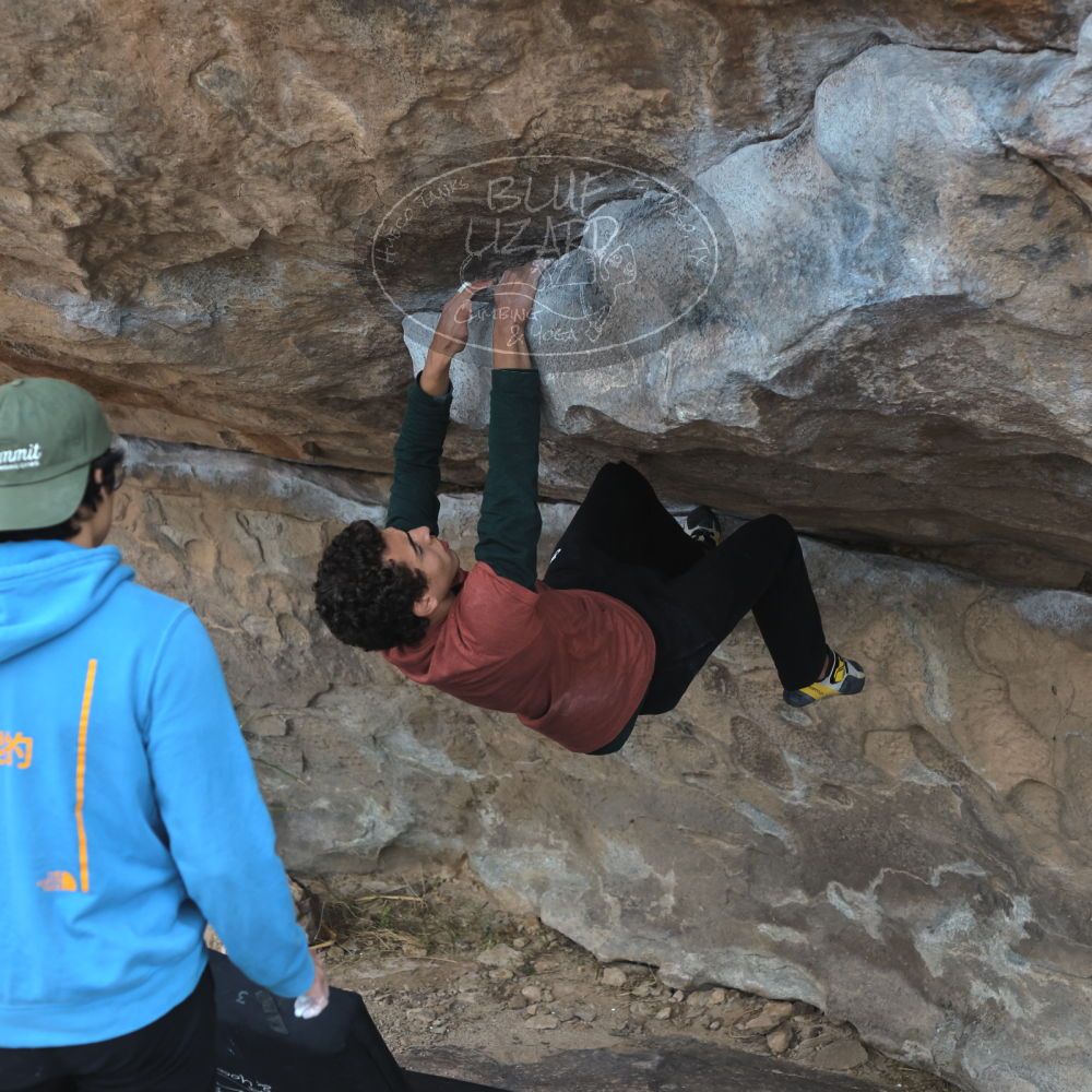 Blue Lizard Climbing and Yoga Hueco Tanks guiding on December 30, 2021, with Alastair, Callum, Chris, Giovanna, and Michael |