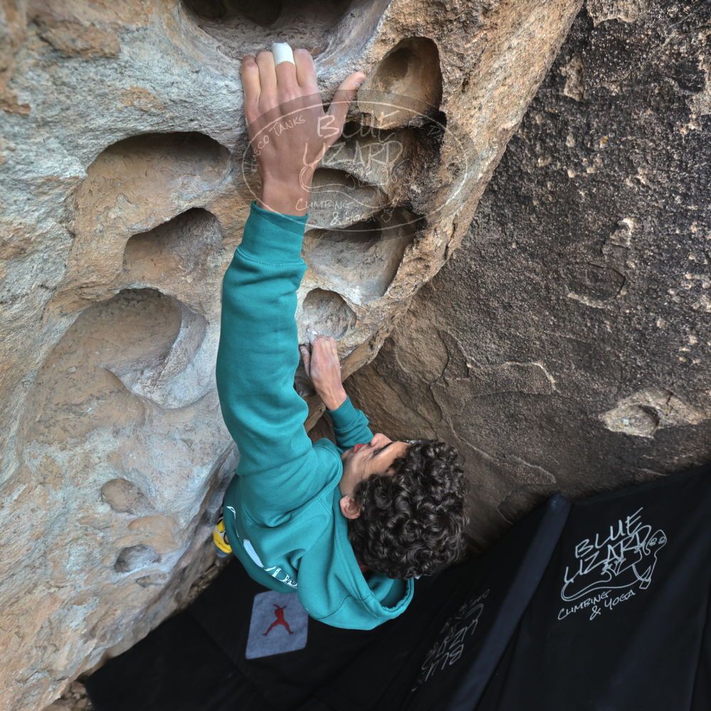 Blue Lizard Climbing and Yoga Hueco Tanks guiding on December 30, 2021, with Alastair, Callum, Chris, Giovanna, and Michael |