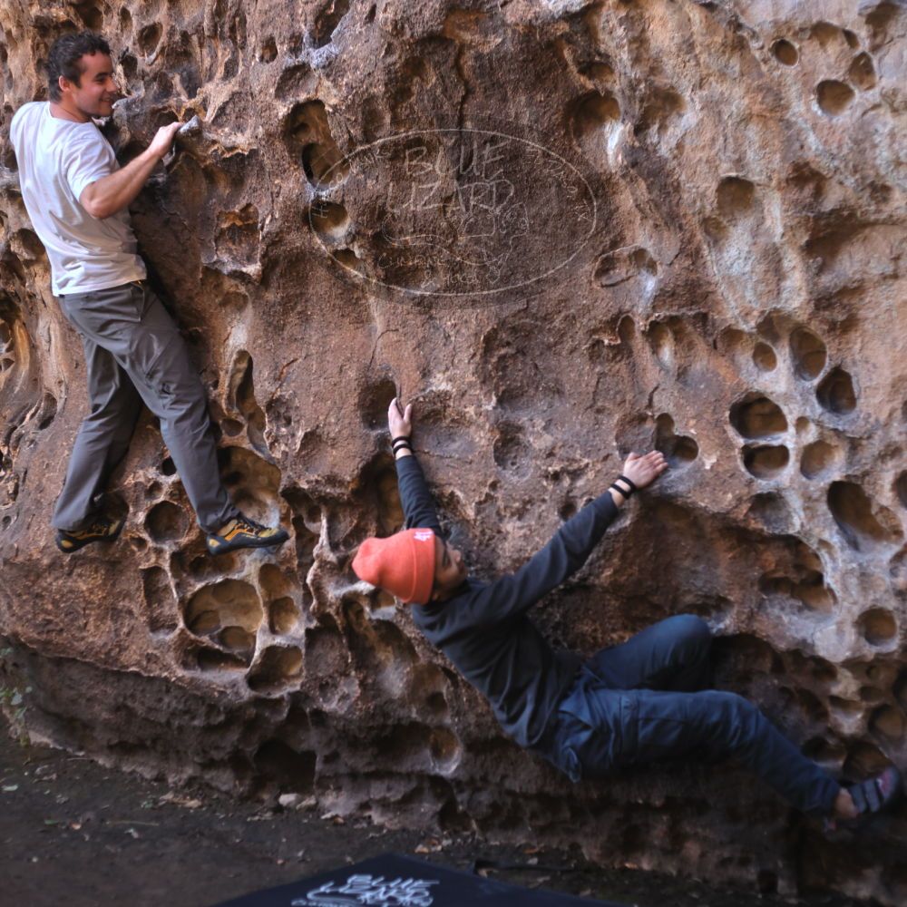 Blue Lizard Climbing and Yoga Hueco Tanks guiding on January 7, 2022, with Anna, John, Mark, and Sue