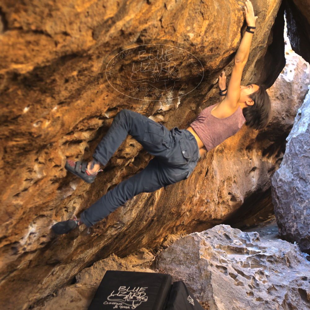 Blue Lizard Climbing and Yoga Hueco Tanks guiding on January 7, 2022, with Anna, John, Mark, and Sue