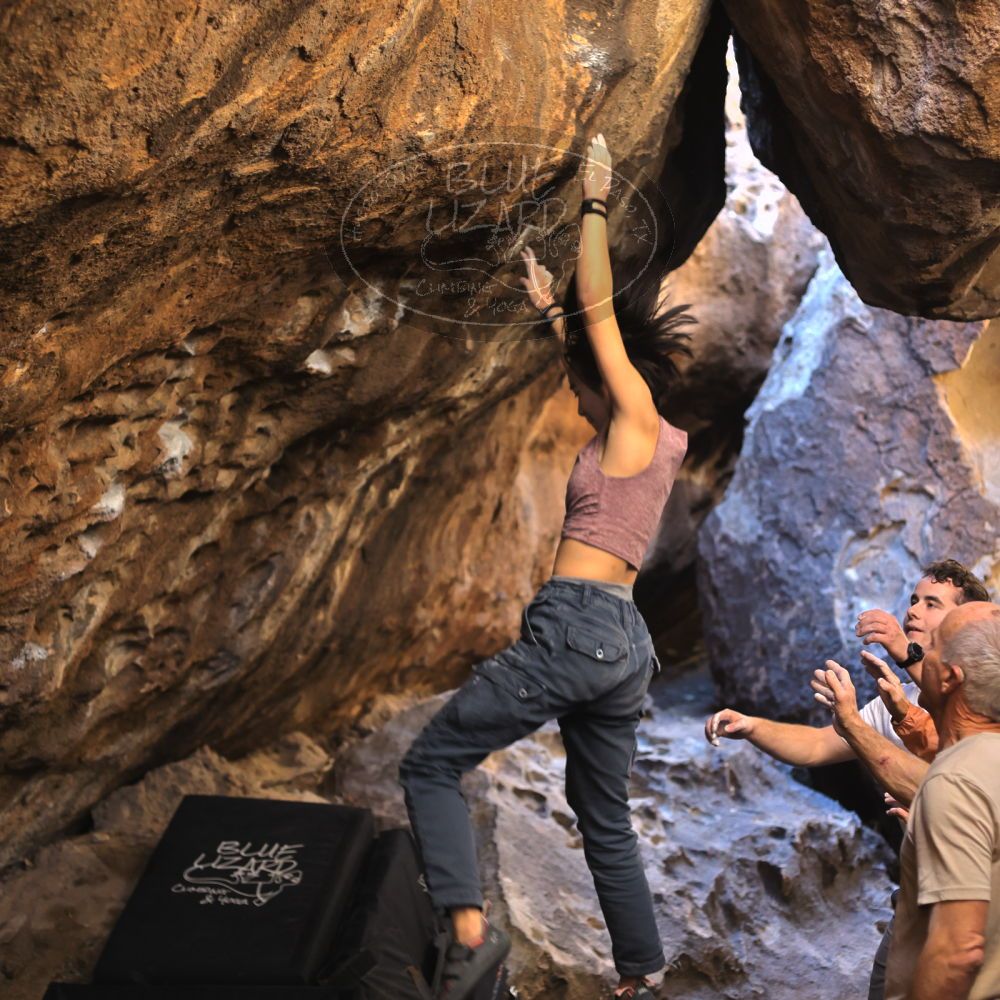 Blue Lizard Climbing and Yoga Hueco Tanks guiding on January 7, 2022, with Anna, John, Mark, and Sue