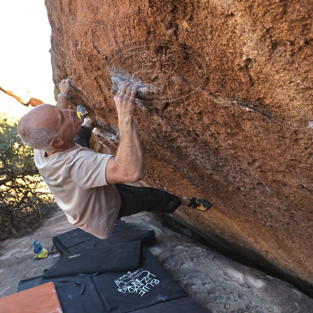 Blue Lizard Climbing and Yoga Hueco Tanks guiding on January 7, 2022, with Anna, John, Mark, and Sue
