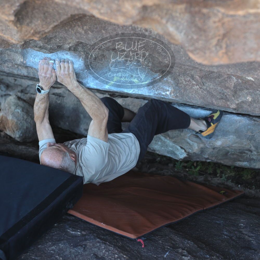 Blue Lizard Climbing and Yoga Hueco Tanks guiding on January 7, 2022, with Anna, John, Mark, and Sue