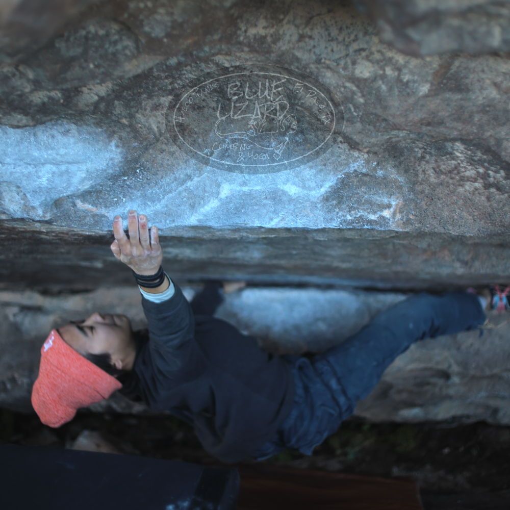 Blue Lizard Climbing and Yoga Hueco Tanks guiding on January 7, 2022, with Anna, John, Mark, and Sue