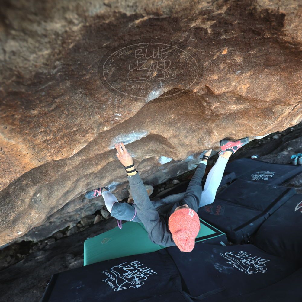 Blue Lizard Climbing and Yoga Hueco Tanks guiding on January 7, 2022, with Anna, John, Mark, and Sue