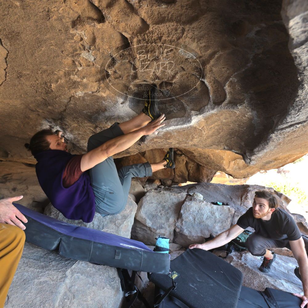 Blue Lizard Climbing and Yoga Hueco Tanks guiding on February 20, 2022, with Cam, Ian, Kamal & Jessica, Mike, and Nick