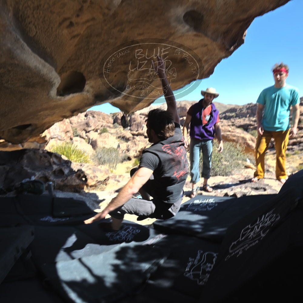 Blue Lizard Climbing and Yoga Hueco Tanks guiding on February 20, 2022, with Cam, Ian, Kamal & Jessica, Mike, and Nick