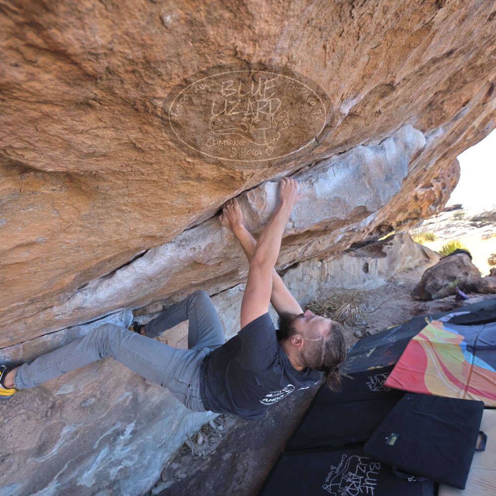 Blue Lizard Climbing and Yoga Hueco Tanks guiding on February 26, 2022, with AJ, Bradley, Caleb, and Chase