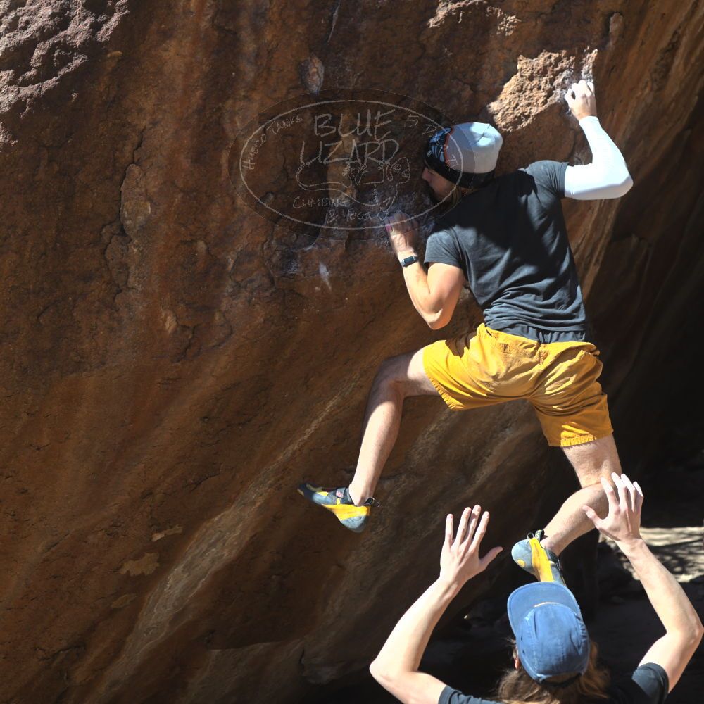 Blue Lizard Climbing and Yoga Hueco Tanks guiding on February 26, 2022, with AJ, Bradley, Caleb, and Chase