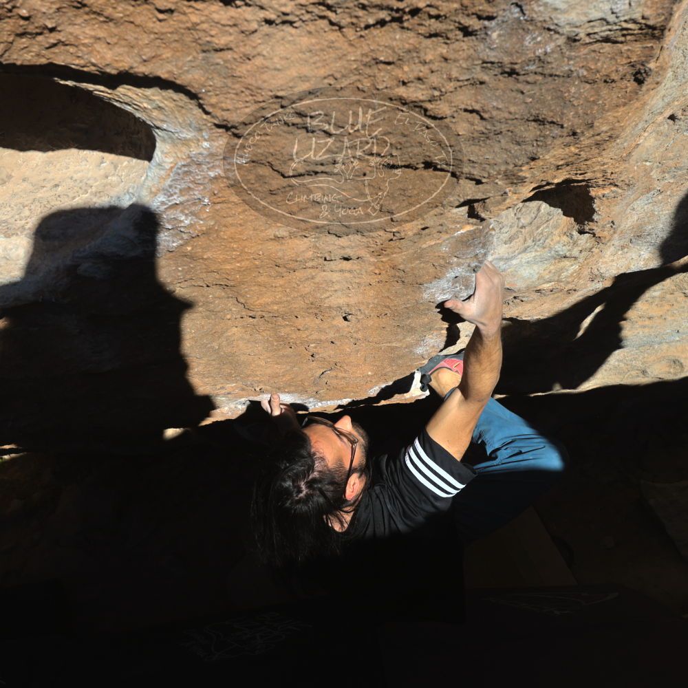 Blue Lizard Climbing and Yoga Hueco Tanks guiding on February 26, 2022, with AJ, Bradley, Caleb, and Chase