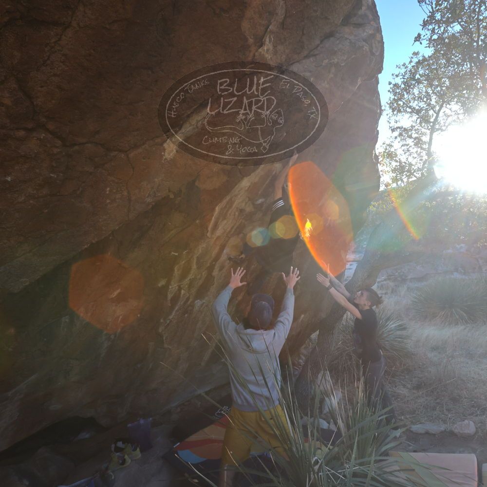 Blue Lizard Climbing and Yoga Hueco Tanks guiding on February 26, 2022, with AJ, Bradley, Caleb, and Chase