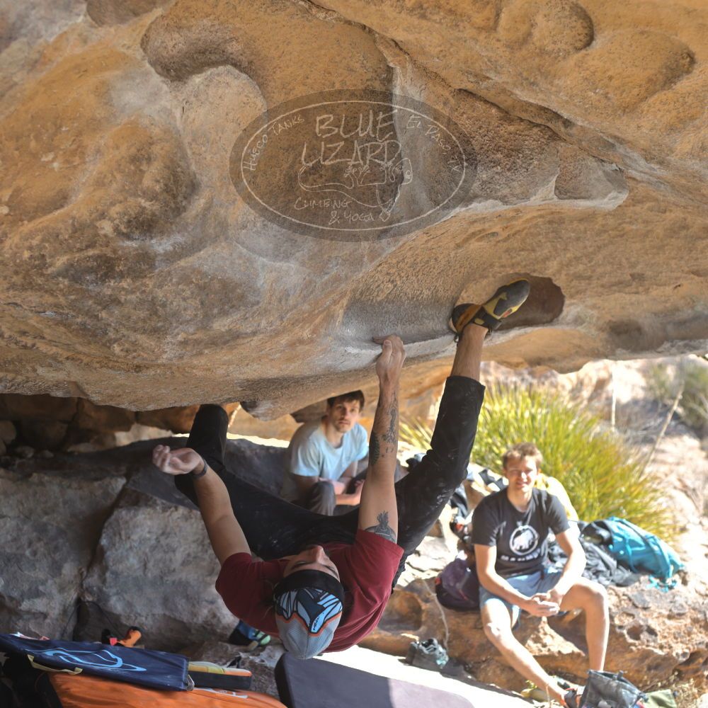 Blue Lizard Climbing and Yoga Hueco Tanks guiding on February 27, 2022, with AJ, Bradley, Caleb, and Chase