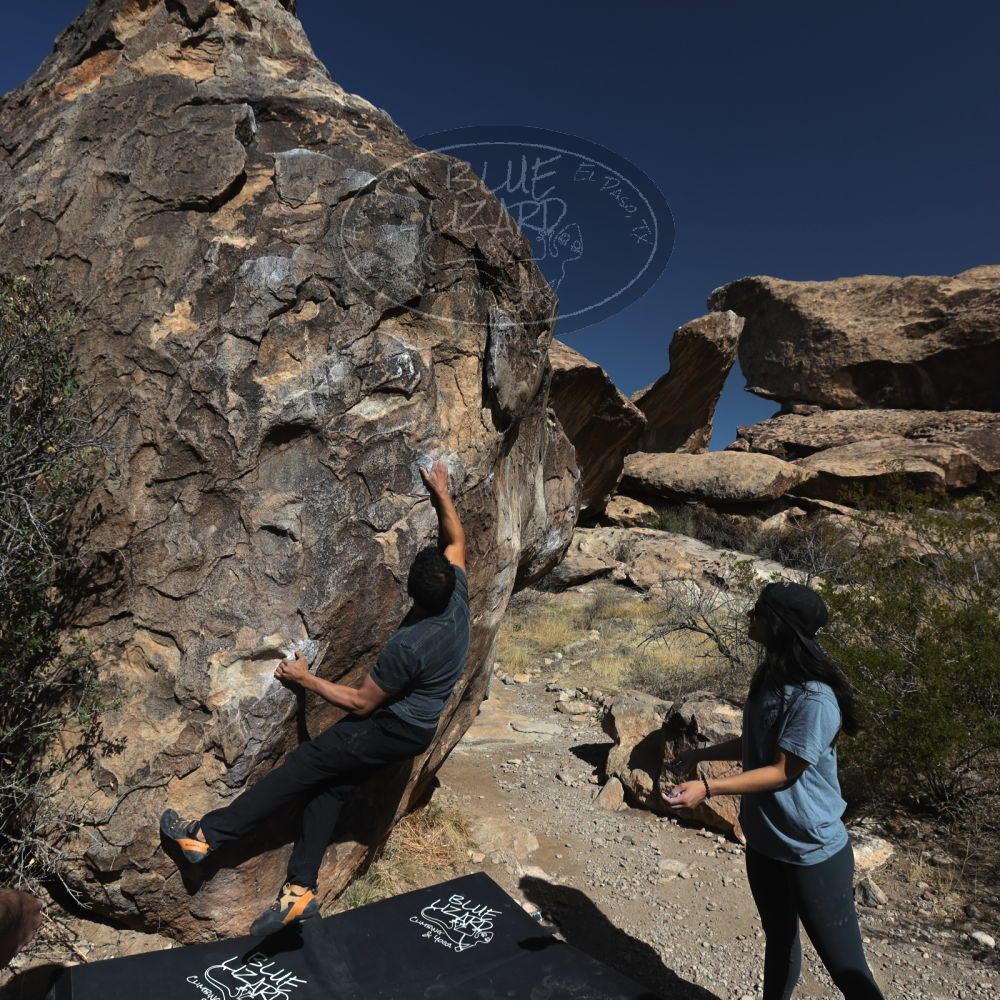 Blue Lizard Climbing and Yoga Hueco Tanks guiding on April 8, 2022, with Andrew, Cadzie, Matt, Matteo, Morgan, and Oscar |