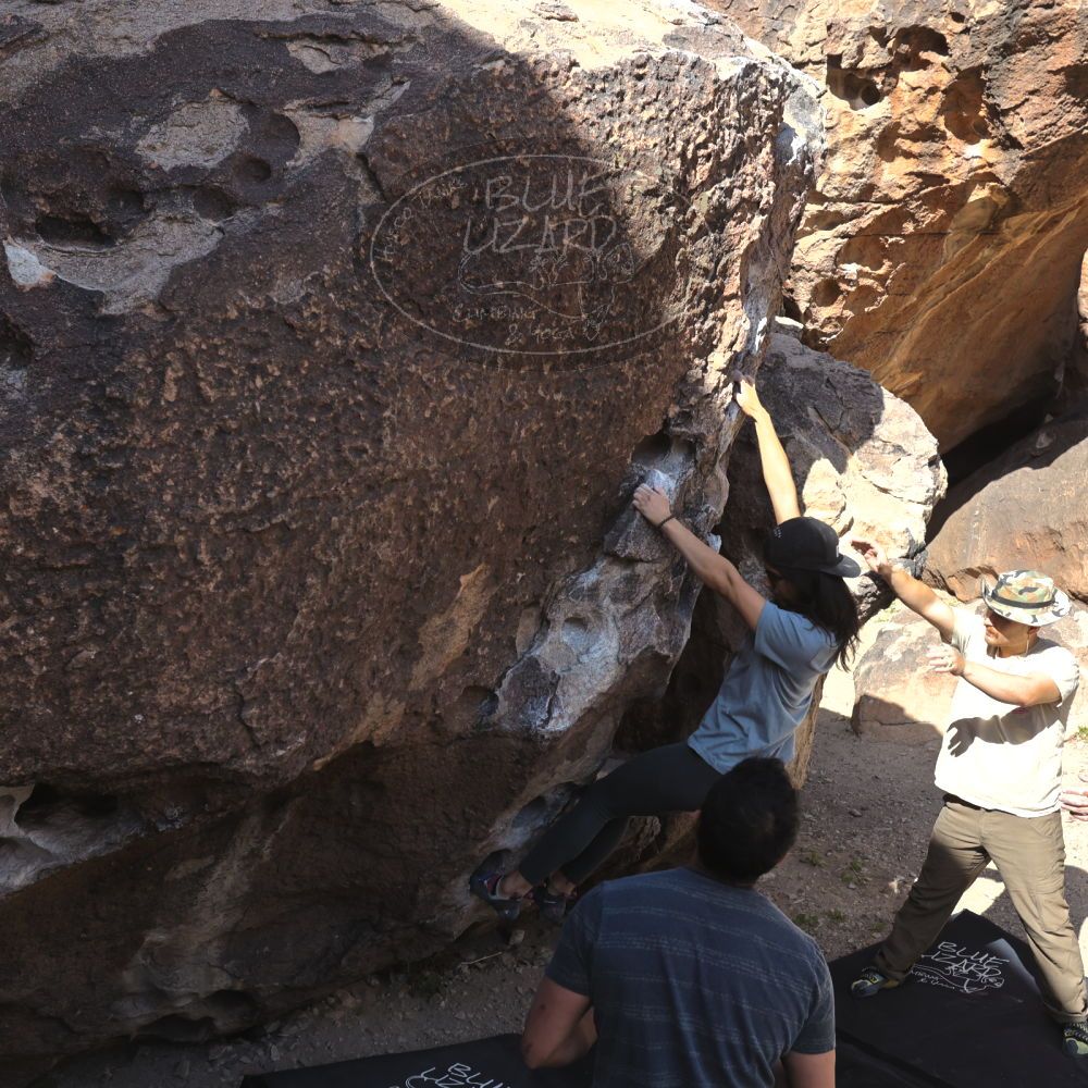 Blue Lizard Climbing and Yoga Hueco Tanks guiding on April 8, 2022, with Andrew, Cadzie, Matt, Matteo, Morgan, and Oscar |