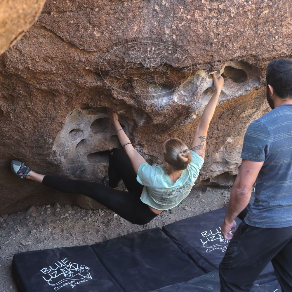 Blue Lizard Climbing and Yoga Hueco Tanks guiding on April 8, 2022, with Andrew, Cadzie, Matt, Matteo, Morgan, and Oscar |